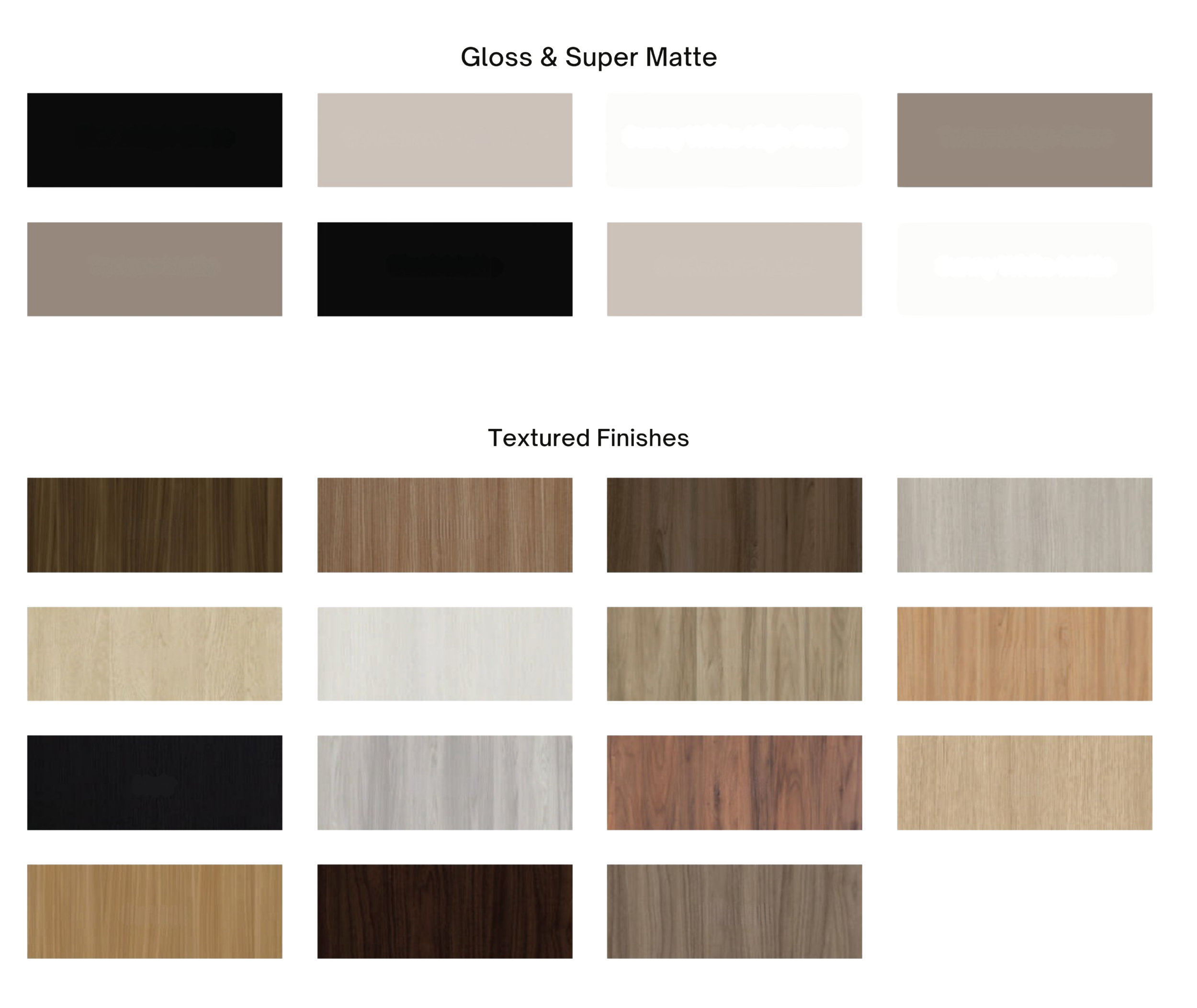 A curated palette of 8 Gloss & Super Matte options provides a sleek modern finish. An additional 15 Textured finishes offer depth, warmth, and tactile appeal. Perfect for projects requiring contemporary sophistication with lasting durability.